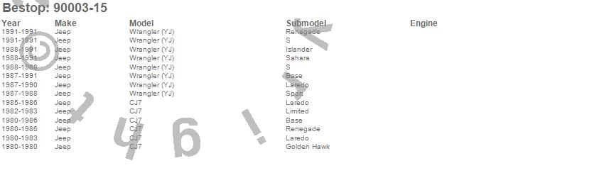 Below is an abbreviated list of applications for the Duster Deck Cover.CJ7, Wrangler (YJ), Jeep, 1991, 1990, 1989, 1988, 1987, 1986, 1985, 1984, 1983, 1982, 1981, 1980