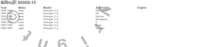 Below is an abbreviated list of applications for the Duster Deck Cover.Wrangler (YJ), Jeep, 1995, 1994, 1993, 1992