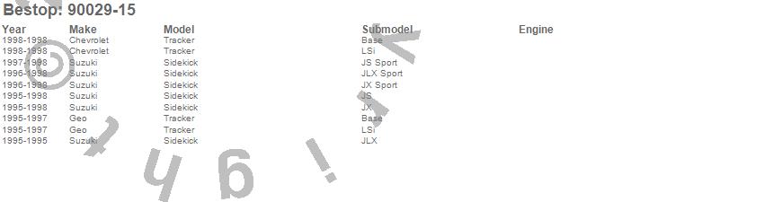 Below is an abbreviated list of applications for the Duster Deck Cover.Sidekick, Tracker, Chevrolet, Geo, Suzuki, 1998, 1997, 1996, 1995