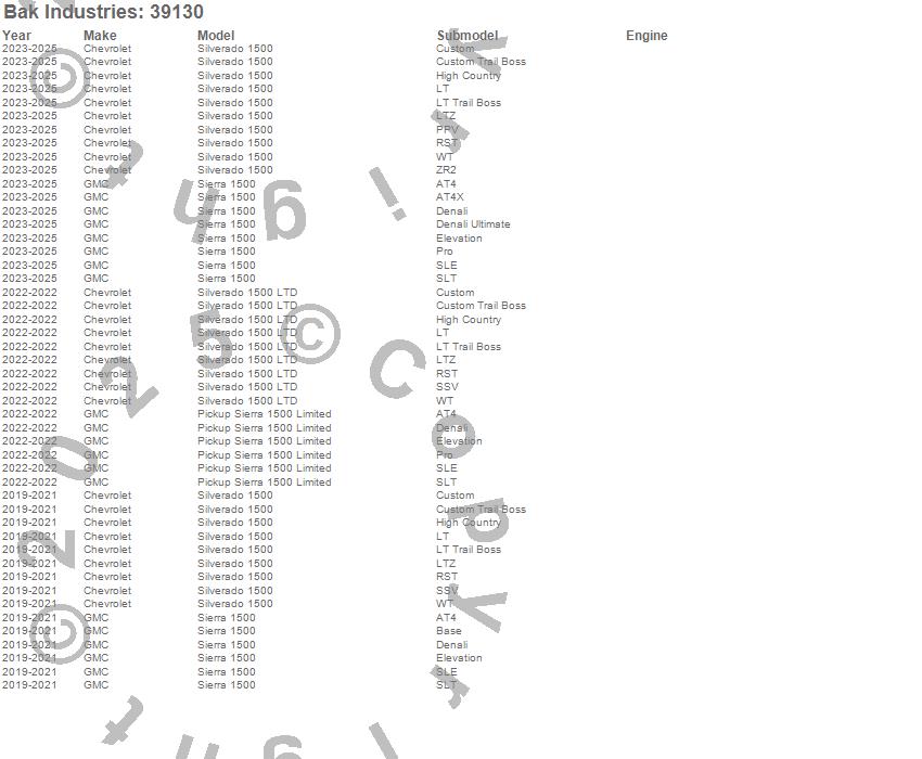 Brand: BAK IndustriesPart Number: 39130Tonneau Cover Type: Black - Vinyl Top w/ Aluminum Underside - Leather Grain FinishUPC: 192631020394