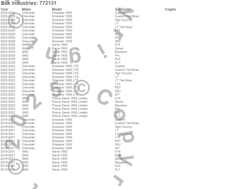 Below is an abbreviated list of applications for the BAKFlip F1 Hard Folding Truck Bed Cover.Pickup Sierra 1500 Limited, Sierra 1500, Silverado 1500, Silverado 1500 LTD, Chevrolet, GMC, 2026, 2025, 2024, 2023, 2022, 2021, 2020, 2019