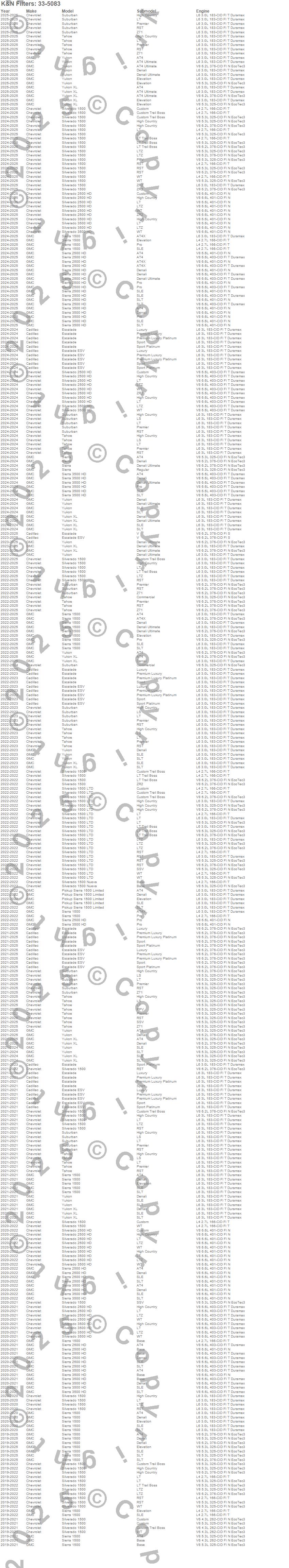 Below is an abbreviated list of applications for the Air Filter.Sierra 1500, Silverado 1500, Chevrolet, GMC, 2020, 2019