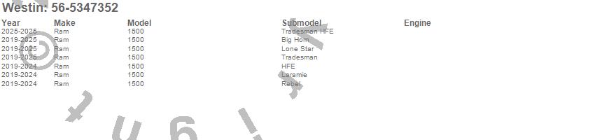 Brand: WestinPart Number: 56-5347352Nerf/Step Bar (Wheel to Wheel) Type: Textured BlackUPC: 707742093092