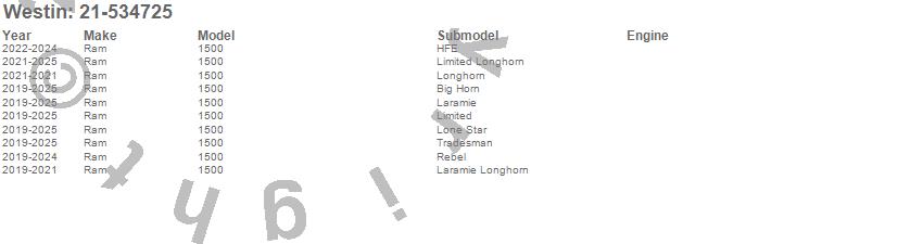 Brand: WestinPart Number: 21-534725Nerf/Step Bar (Wheel to Wheel) Type: Black - w/Mount KitUPC: 707742093108