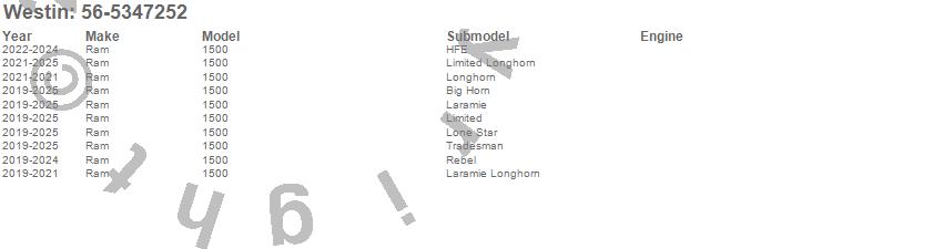 Brand: WestinPart Number: 56-5347252Nerf/Step Bar (Wheel to Wheel) Type: Textured BlackUPC: 707742093078