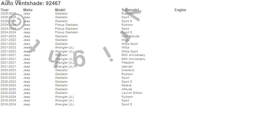 Below is an abbreviated list of applications for the Ventvisor Deflector 2 pc..Gladiator, Pickup Gladiator, Wrangler, Wrangler (JL), Jeep, 2026, 2025, 2024, 2023, 2022, 2021, 2020, 2019, 2018