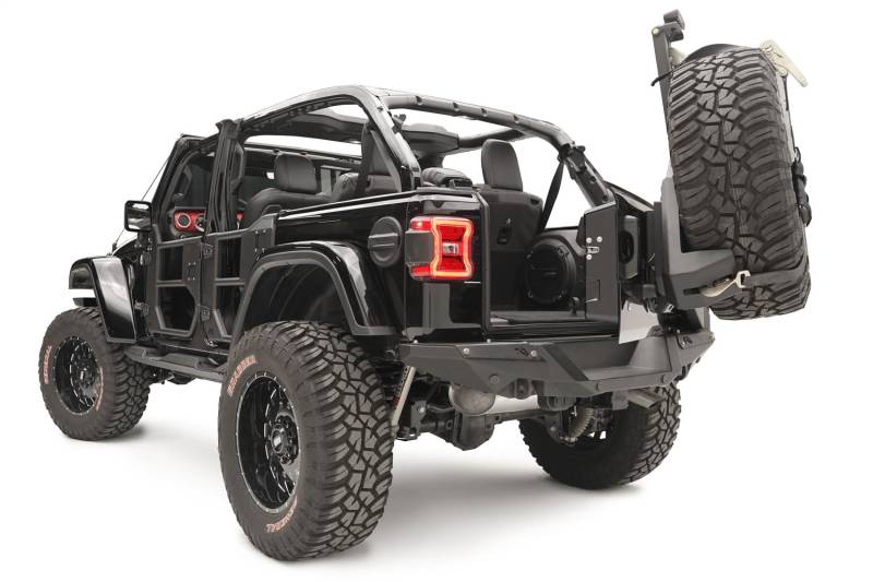 Buy this Spare Tire Carrier Fab Fours JL2070-1 2 Stage Black Powder Coated - Slant Back Tire Carrier here at SVCustoms.com an authorized Fab Fours Spare Tire Carrier dealer and distributor.