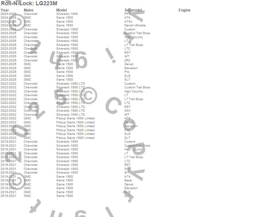 Below is an abbreviated list of applications for the Roll-N-Lock M-Series Truck Bed Cover.Pickup Sierra 1500 Limited, Sierra 1500, Silverado 1500, Silverado 1500 LTD, Chevrolet, GMC, 2025, 2024, 2023, 2022, 2021, 2020, 2019