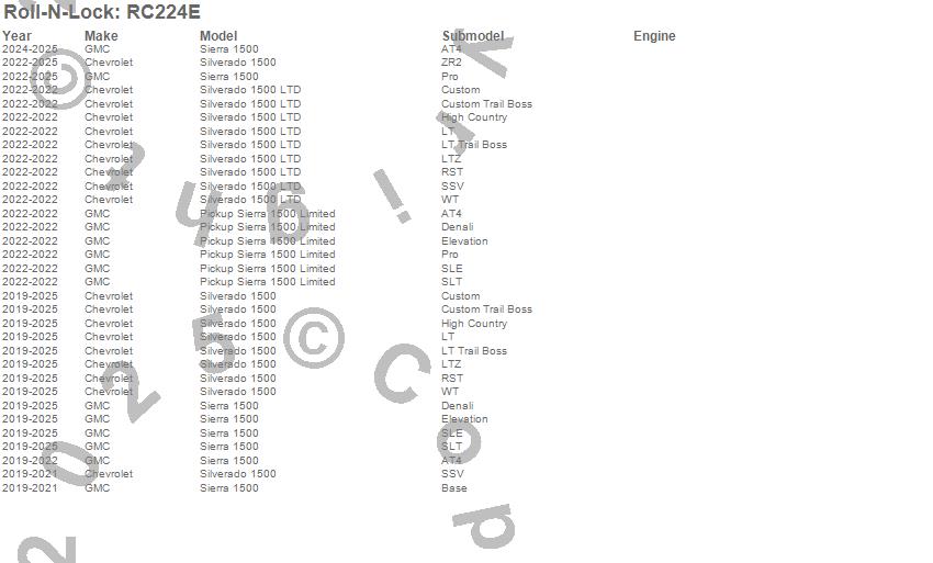 Below is an abbreviated list of applications for the Roll-N-Lock E-Series Tonneau Cover.Pickup Sierra 1500 Limited, Sierra 1500, Silverado 1500, Silverado 1500 LTD, Chevrolet, GMC, 2025, 2024, 2023, 2022, 2021, 2020, 2019