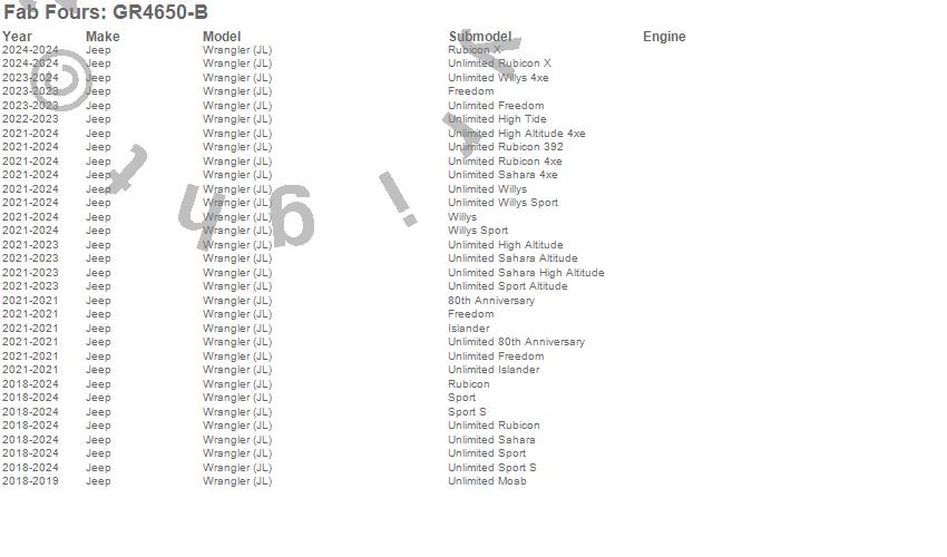 Below is an abbreviated list of applications for the Grumper Front Bumper.Wrangler (JL), Jeep, 2024, 2023, 2022, 2021, 2020, 2019, 2018