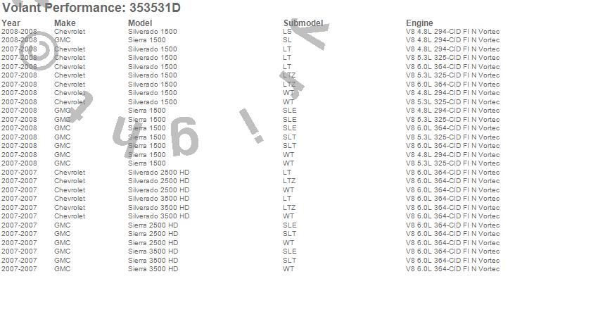 Below is an abbreviated list of applications for the Cold Air Intake Kit.Sierra 1500, Sierra 2500 HD, Sierra 3500 HD, Silverado 1500, Silverado 2500 HD, Silverado 3500 HD, Chevrolet, GMC, 2008, 2007