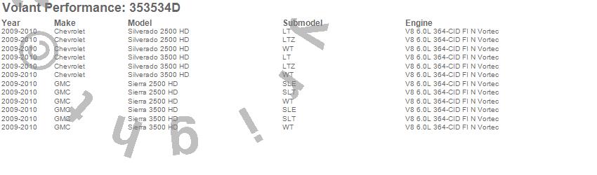Below is an abbreviated list of applications for the Cold Air Intake Kit.Sierra 2500 HD, Sierra 3500 HD, Silverado 2500 HD, Silverado 3500 HD, Chevrolet, GMC, 2010, 2009