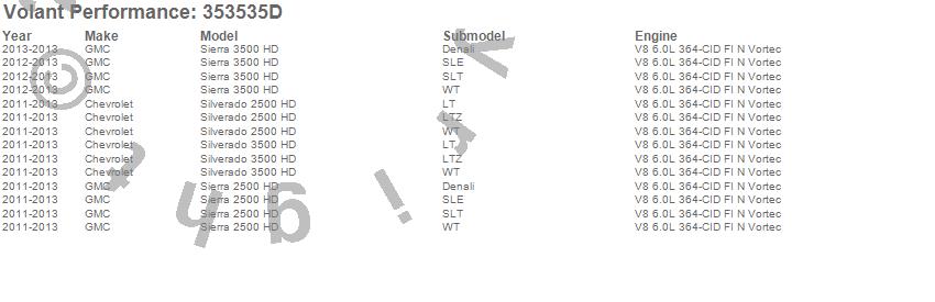 Below is an abbreviated list of applications for the Cold Air Intake Kit.Sierra 2500 HD, Sierra 3500 HD, Silverado 2500 HD, Silverado 3500 HD, Chevrolet, GMC, 2013, 2012, 2011