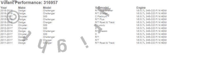 Below is an abbreviated list of applications for the Cold Air Intake Kit.300, Challenger, Charger, Chrysler, Dodge, 2017, 2016, 2015, 2014, 2013, 2012, 2011
