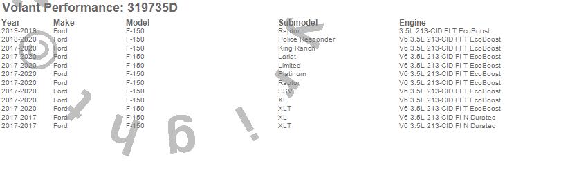 Below is an abbreviated list of applications for the Cold Air Intake Kit.F-150, Ford, 2020, 2019, 2018, 2017