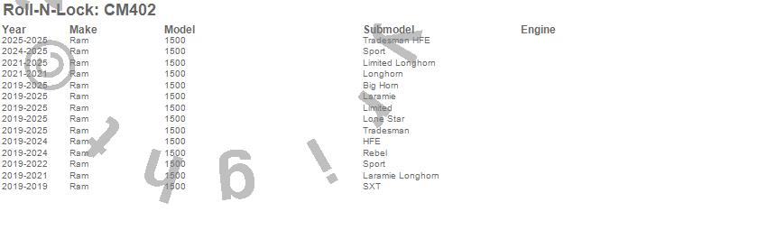 Brand: Roll-N-LockPart Number: CM402Truck Bed Organizer Type: Excludes Beds w/Rambox Cargo Management SystemUPC: 725478201239