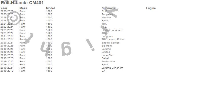 Brand: Roll-N-LockPart Number: CM401Truck Bed Organizer Type: Excludes Beds w/Rambox Cargo Management SystemUPC: 725478201222