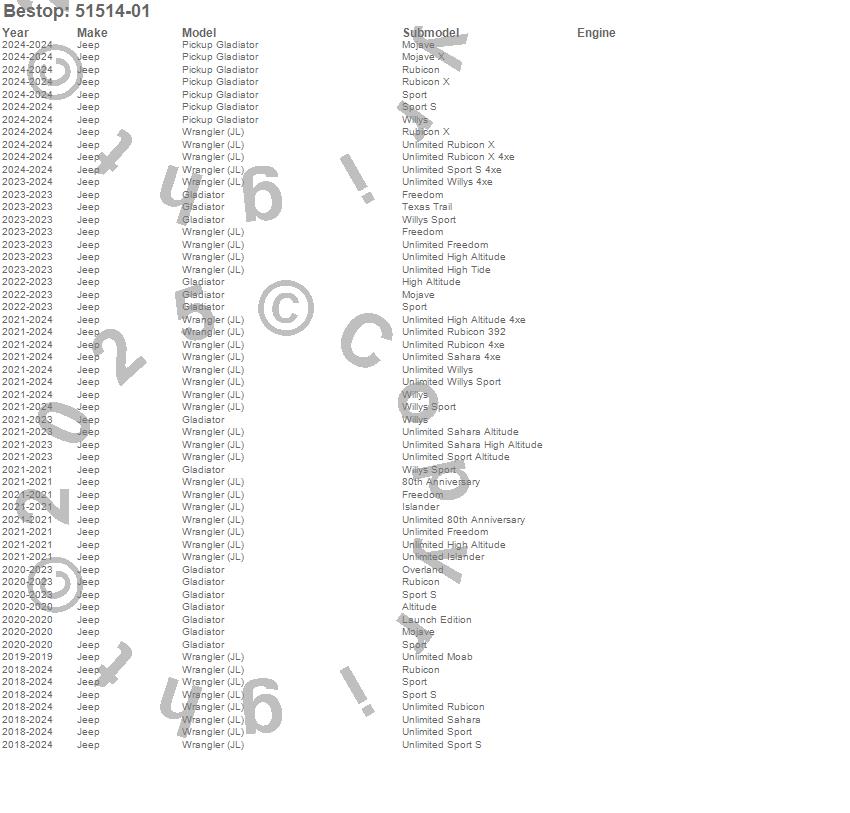 Below is an abbreviated list of applications for the Floor Mats.Gladiator, Pickup Gladiator, Wrangler (JL), Jeep, 2024, 2023, 2022, 2021, 2020, 2019, 2018