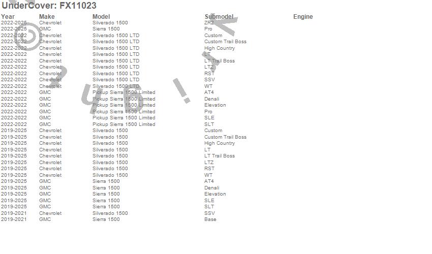 Below is an abbreviated list of applications for the FLEX Tonneau Cover.Pickup Sierra 1500 Limited, Sierra 1500, Silverado 1500, Silverado 1500 LTD, Chevrolet, GMC, 2026, 2025, 2024, 2023, 2022, 2021, 2020, 2019