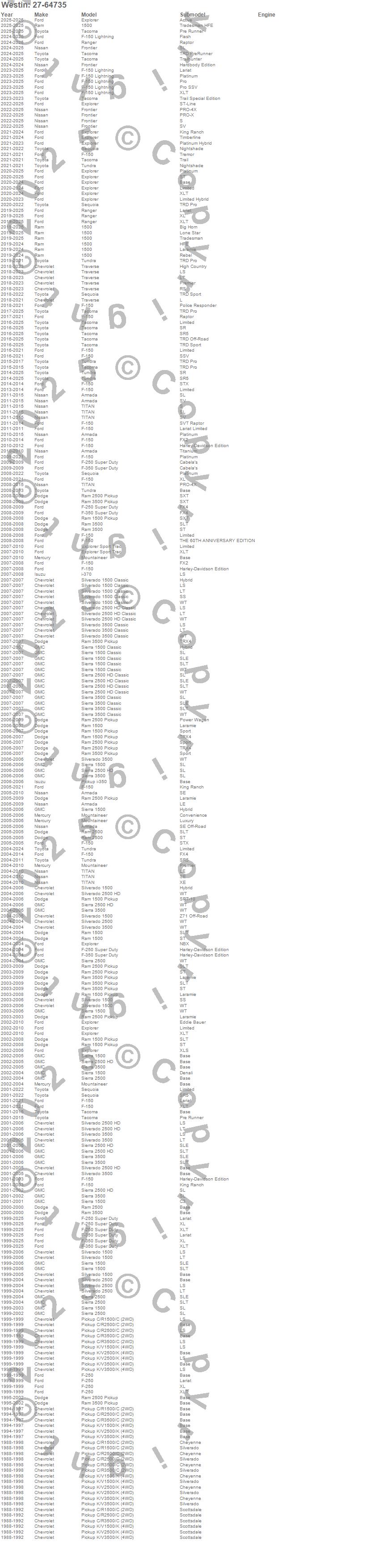 Brand: WestinPart Number: 27-64735Running Board Type: Black Aluminum - 79 in. Length - Does Not Include Mount Kit - Vehicle Specific Mount Kit Must Be Purchased SeparatelyUPC: 707742091227