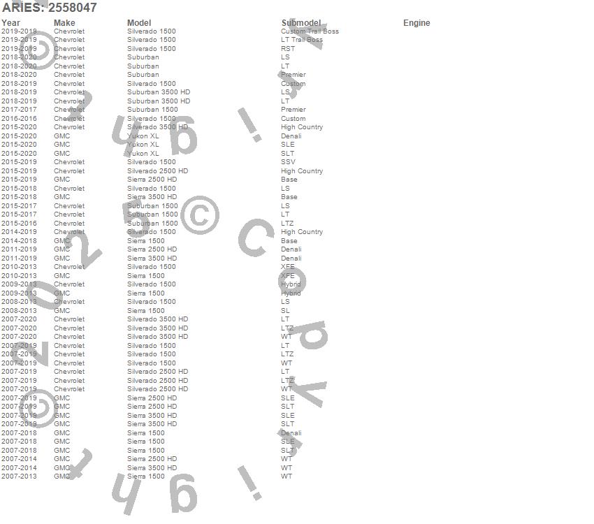 Below is an abbreviated list of applications for the AscentStep Running Boards w/Mounting Brackets.Sierra 1500, Sierra 2500 HD, Sierra 3500 HD, Silverado 1500, Silverado 2500 HD, Silverado 3500 HD, Suburban, Suburban 1500, Suburban 3500 HD, Yukon XL, Chevrolet, GMC, 2020, 2019, 2018, 2017, 2016, 2015, 2014, 2013