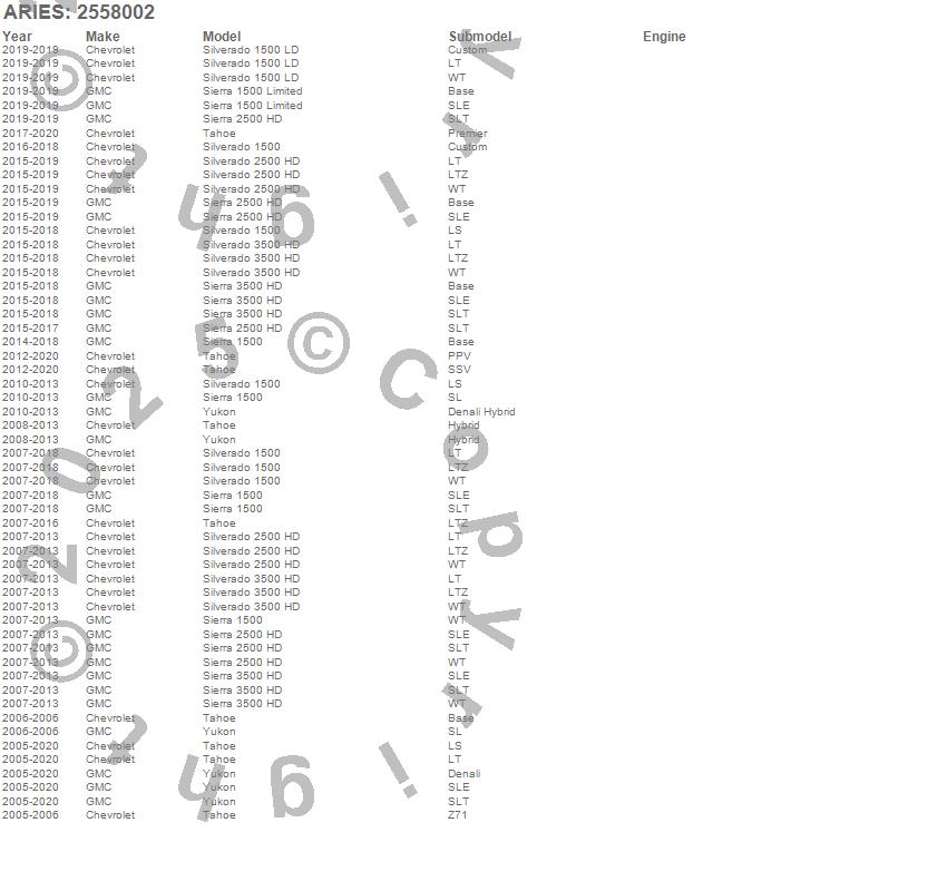 Below is an abbreviated list of applications for the AscentStep Running Boards w/Mounting Brackets.Sierra 1500, Sierra 1500 Limited, Sierra 2500 HD, Sierra 3500 HD, Silverado 1500, Silverado 1500 LD, Silverado 2500 HD, Silverado 3500 HD, Tahoe, Yukon, Chevrolet, GMC, 2020, 2019, 2018, 2017, 2016, 2015, 2014, 2013