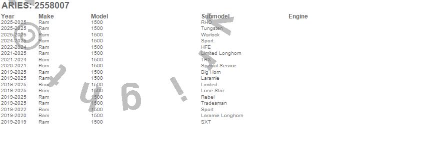 Brand: ARIESPart Number: 2558007Running Board Type: 5.5 in. - Incl. AscentStep Running Boards PN[2057991] And VersaTrac Brackets PN[2055117] - Carbon Steel - Carbide Black Powder CoatUPC: 849055031931
