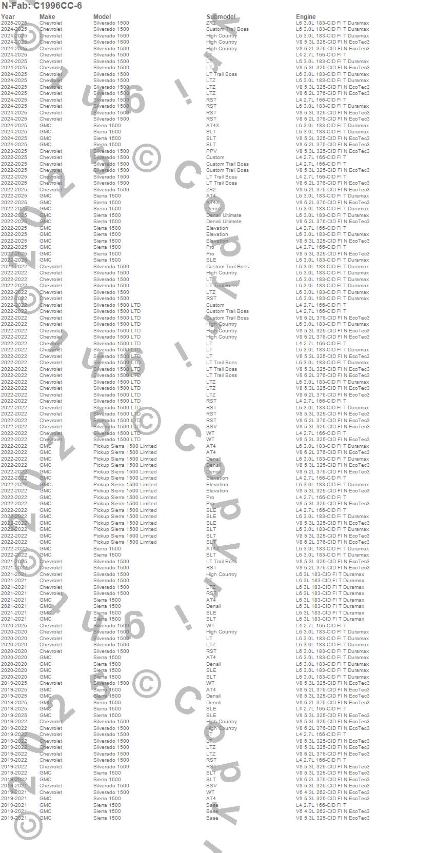 Below is an abbreviated list of applications for the Wheel To Wheel Nerf Step Bar.Pickup Sierra 1500 Limited, Sierra 1500, Silverado 1500, Silverado 1500 LTD, Chevrolet, GMC, 2026, 2025, 2024, 2023, 2022, 2021, 2020, 2019