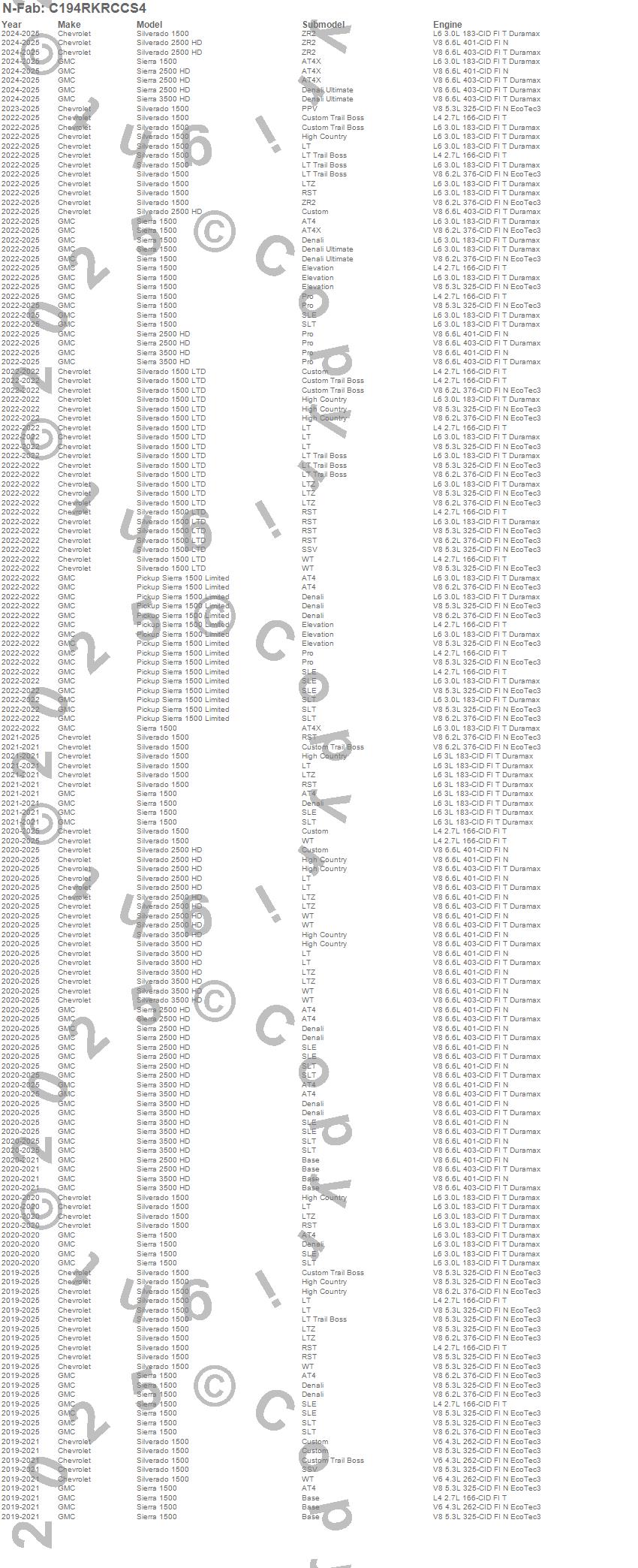 Below is an abbreviated list of applications for the RKR Cab Length Step System.Pickup Sierra 1500 Limited, Sierra 1500, Sierra 2500 HD, Sierra 3500 HD, Silverado 1500, Silverado 1500 LTD, Silverado 2500 HD, Silverado 3500 HD, Chevrolet, GMC, 2025, 2024, 2023, 2022, 2021, 2020, 2019
