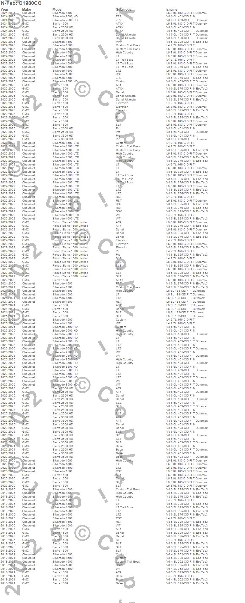 Below is an abbreviated list of applications for the Cab Length Nerf Step Bar.Pickup Sierra 1500 Limited, Sierra 1500, Sierra 2500 HD, Sierra 3500 HD, Silverado 1500, Silverado 1500 LTD, Silverado 2500 HD, Silverado 3500 HD, Chevrolet, GMC, 2025, 2024, 2023, 2022, 2021, 2020, 2019