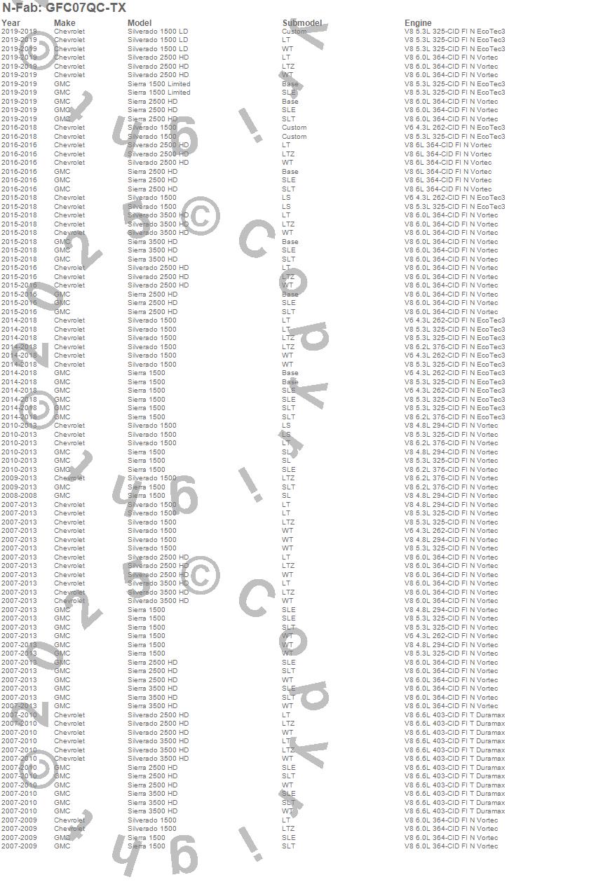 Below is an abbreviated list of applications for the Growler Step System.Sierra 1500, Sierra 1500 Limited, Sierra 2500 HD, Sierra 3500 HD, Silverado 1500, Silverado 1500 LD, Silverado 2500 HD, Silverado 3500 HD, Chevrolet, GMC, 2019, 2018, 2017, 2016, 2015, 2014, 2013, 2012, 2011, 2010