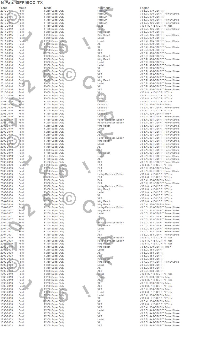 Below is an abbreviated list of applications for the Growler Step System.F-250 Super Duty, F-350 Super Duty, F-450 Super Duty, Ford, 2016, 2015, 2014, 2013, 2012, 2011, 2010, 2009, 2008, 2007, 2006, 2005, 2004, 2003, 2002, 2001