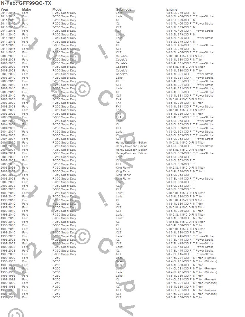 Below is an abbreviated list of applications for the Growler Step System.F-250, F-250 Super Duty, F-350 Super Duty, Ford, 2016, 2015, 2014, 2013, 2012, 2011, 2010, 2009, 2008, 2007, 2006, 2005, 2004, 2003, 2002, 2001