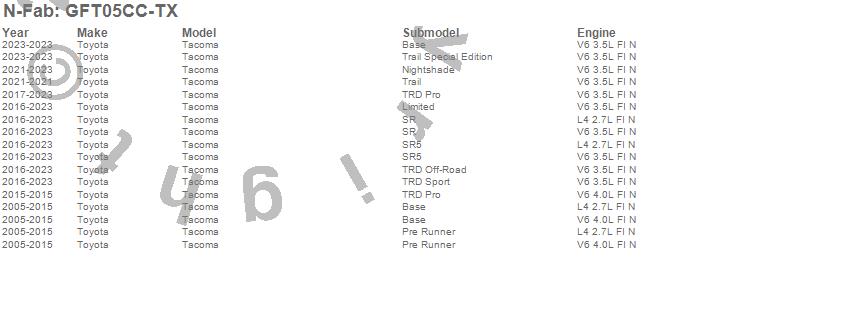 Below is an abbreviated list of applications for the Growler Step System.Tacoma, Toyota, 2023, 2022, 2021, 2020, 2019, 2018, 2017, 2016, 2015, 2014, 2013, 2012, 2011, 2010, 2009, 2008, 2007, 2006