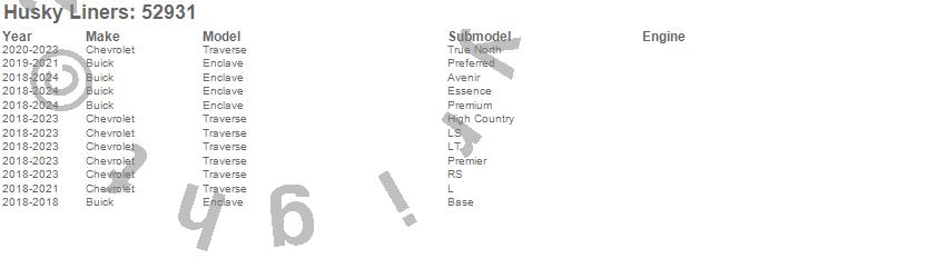 Below is an abbreviated list of applications for the X-act Contour Floor Liner.Enclave, Traverse, Traverse Limited, Buick, Chevrolet, 2024, 2023, 2022, 2021, 2020, 2019, 2018