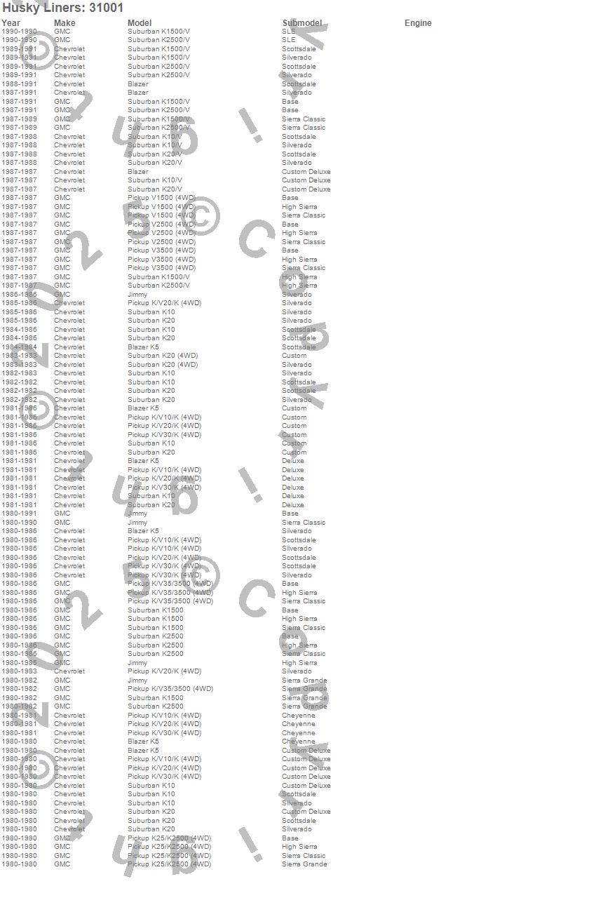 Below is an abbreviated list of applications for the Classic Style Floor Liner.Blazer, Blazer K5, Jimmy, K10 Pickup, K10 Suburban, K1500 Suburban, K20 Pickup, K20 Suburban, K2500 Pickup, K2500 Suburban, K30 Pickup, K3500 Pickup, V10 Suburban, V1500 Pickup, V1500 Suburban, V20 Suburban, V2500 Pickup, V2500 Suburban, V3500 Pickup, Chevrolet