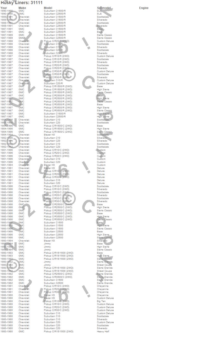 Below is an abbreviated list of applications for the Classic Style Floor Liner.Blazer K5, C10 Pickup, C10 Suburban, C1500 Pickup, C1500 Suburban, C20 Pickup, C20 Suburban, C2500 Pickup, C2500 Suburban, C30 Pickup, C35/C3500 Pickup, C3500 Pickup, Jimmy, R10 Pickup, R10 Suburban, R1500 Pickup, R1500 Suburban, R20 Pickup, R20 Suburban, R2500 Pickup
