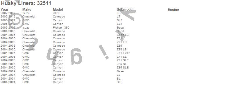 Below is an abbreviated list of applications for the Classic Style Floor Liner.Canyon, Colorado, i-350, i-370, Chevrolet, GMC, Isuzu, 2012, 2011, 2010, 2009, 2008, 2007, 2006, 2005, 2004