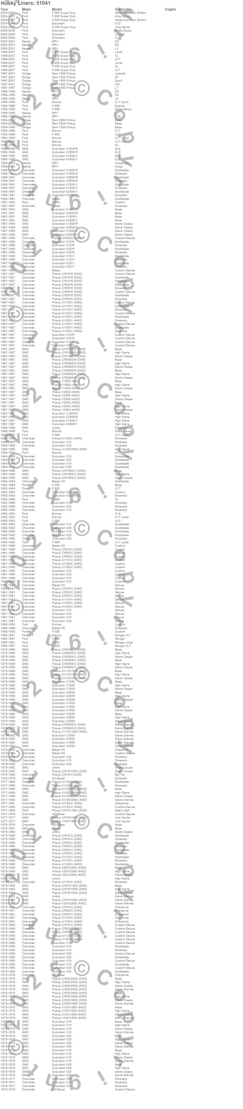 Below is an abbreviated list of applications for the Heavy Duty Floor Mat.Blazer, Blazer K5, Bronco, C10 Pickup, C10 Suburban, C15 Suburban, C1500 Pickup, C1500 Suburban, C20 Pickup, C20 Suburban, C25 Suburban, C25/C2500 Pickup, C2500 Pickup, C2500 Suburban, C30 Pickup, C35/C3500 Pickup, C3500 Pickup, Excursion, F-250 Super Duty, F-350