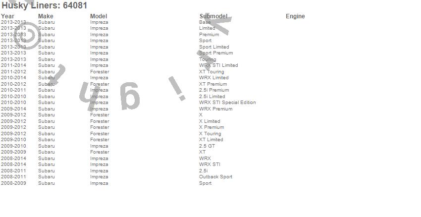 Below is an abbreviated list of applications for the Classic Style Floor Liner.Forester, Impreza, Subaru, 2014, 2013, 2012, 2011, 2010, 2009, 2008