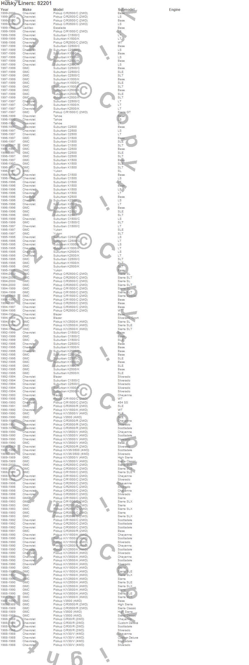 Below is an abbreviated list of applications for the Classic Style Floor Liner Center Hump.Blazer, C1500 Pickup, C1500 Suburban, C2500 Pickup, C2500 Suburban, C3500 Pickup, Escalade, K1500 Pickup, K1500 Suburban, K2500 Pickup, K2500 Suburban, K3500 Pickup, R2500 Pickup, R30 Pickup, R3500 Pickup, Tahoe, V30 Pickup, V3500 Pickup, Yukon, Cadillac