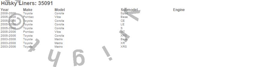 Below is an abbreviated list of applications for the Classic Style Floor Liner.Corolla, Matrix, Vibe, Pontiac, Toyota, 2008, 2007, 2006, 2005, 2004, 2003