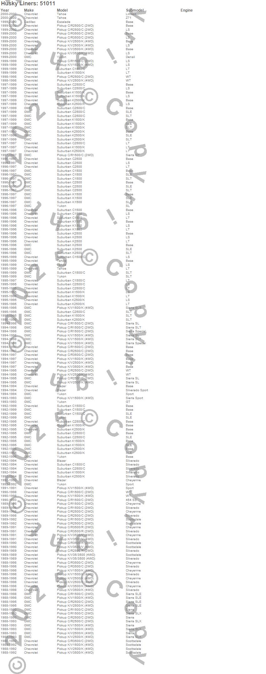 Below is an abbreviated list of applications for the Heavy Duty Floor Mat.Blazer, C1500 Pickup, C1500 Suburban, C2500 Pickup, C2500 Suburban, C3500 Pickup, Escalade, K1500, K1500 Pickup, K1500 Suburban, K2500 Pickup, K2500 Suburban, K3500 Pickup, R2500 Pickup, R3500 Pickup, Tahoe, V3500 Pickup, Yukon, Cadillac, Chevrolet