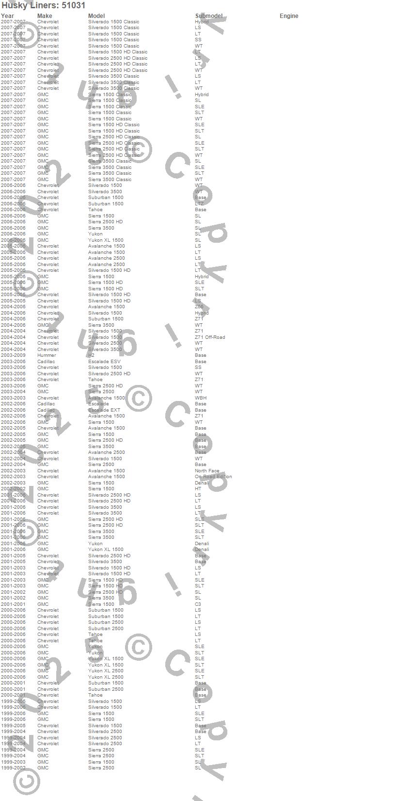 Below is an abbreviated list of applications for the Heavy Duty Floor Mat.Avalanche 1500, Avalanche 2500, Escalade, Escalade ESV, Escalade EXT, H2, Sierra 1500, Sierra 1500 Classic, Sierra 1500 HD, Sierra 1500 HD Classic, Sierra 2500, Sierra 2500 HD, Sierra 2500 HD Classic, Sierra 3500, Sierra 3500 Classic, Silverado 1500, Silverado 1500 Classic, Silverado 1500 HD, Silverado 1500 HD Classic, Silverado 2500