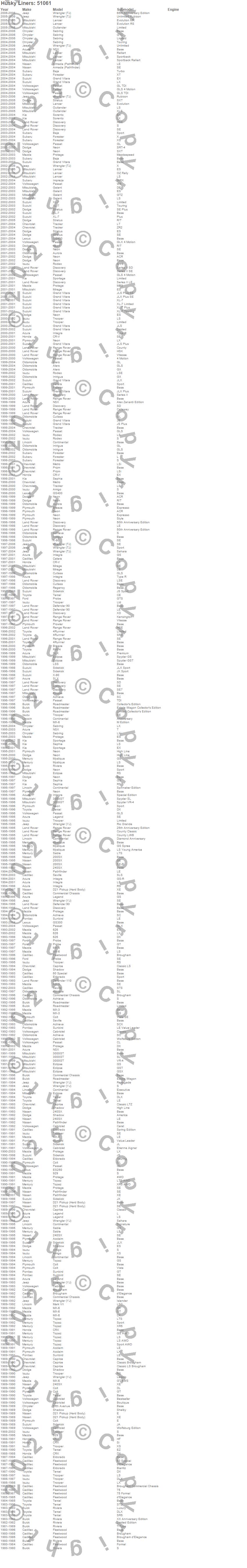 Below is an abbreviated list of applications for the Heavy Duty Floor Mat.200SX, 240SX, 3000GT, 4Runner, 60 Special, 626, 929, Acclaim, Achieva, Alero, Amigo, Armada (Pathfinder), Aurora, Baja, Breeze, Brougham, Cabriolet, Caprice, Catera, Colt