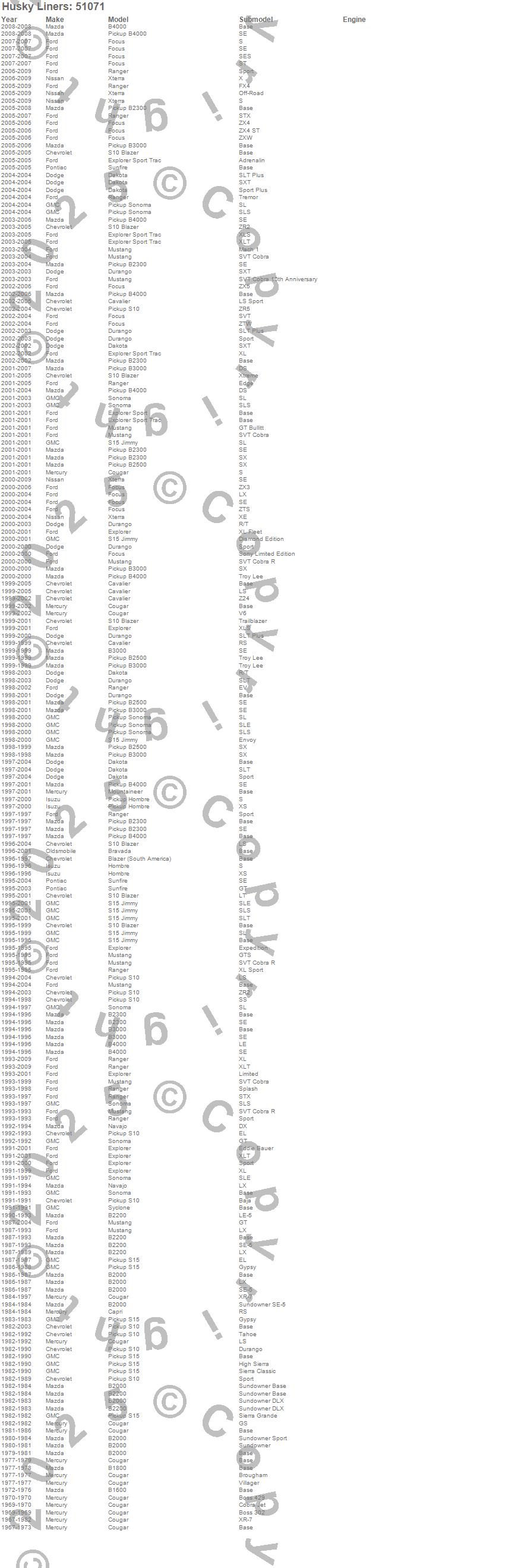 Below is an abbreviated list of applications for the Heavy Duty Floor Mat.B1600, B1800, B2000, B2200, B2300, B2500, B3000, B4000, Blazer (South America), Bravada, Capri, Cavalier, Cougar, Dakota, Durango, Explorer, Explorer Sport, Explorer Sport Trac, Focus, Hombre