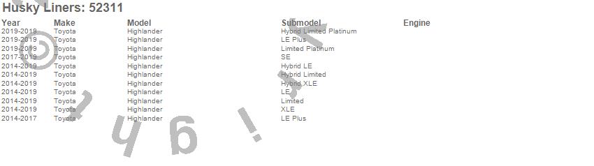 Below is an abbreviated list of applications for the X-act Contour Floor Liner.Highlander, Toyota, 2019, 2018, 2017, 2016, 2015, 2014