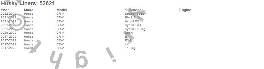 Below is an abbreviated list of applications for the X-act Contour Floor Liner.CR-V, Honda, 2022, 2021, 2020, 2019, 2018, 2017