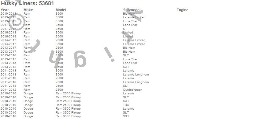 Below is an abbreviated list of applications for the X-act Contour Floor Liner.2500, 3500, Ram 2500, Ram 3500, Dodge, Ram, 2019, 2018, 2017, 2016, 2015, 2014, 2013, 2012, 2011, 2010