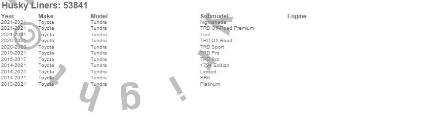 Below is an abbreviated list of applications for the X-act Contour Floor Liner.Tundra, Toyota, 2021, 2020, 2019, 2018, 2017, 2016, 2015, 2014, 2013